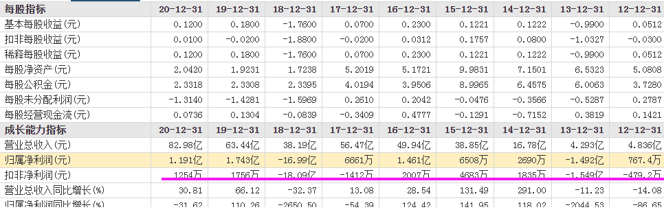 緊接著,2019年、2020年營業收入繼續飆升,分別增至63.44億元、82.98億元,歸母淨利潤分別為1.74億元、1.19億元,而扣非淨利潤僅為1756萬元、1254萬元。