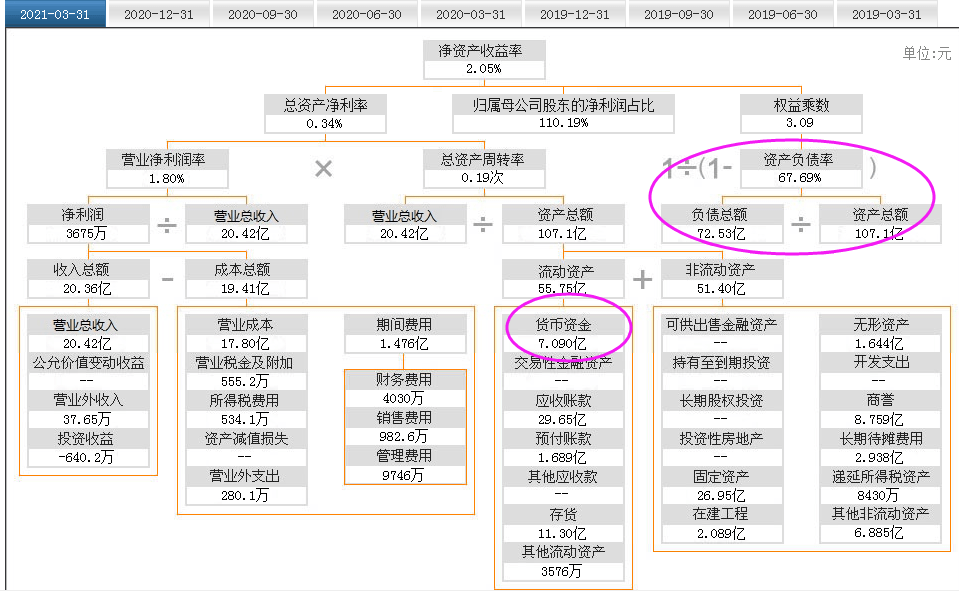 截至2021年一季度末,公司流動資產合計55.75億元,而流動負債合計高達59.88億元,短期償債壓力較大;其中短期借款、一年內到期的非流動負債合計逾34億元,對於帳上的7億多資金著實捉襟見肘!!!