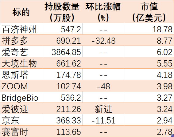 第一大重倉股仍然是百濟神州,持股數量較一季度沒有變化,截至二季度末的持倉市值為18.78億美元。前五大重倉股分別是百濟神州、拼多多、愛奇藝、天境生物和恩斯塔,持有市值分別為18.78億美元、8.77億美元、6.02億美元、5.55億美元和4.18億美元。