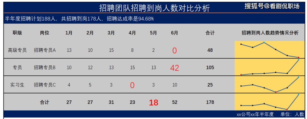 以招聘完成率指標為例,既可以分析招聘崗位的計劃完成率,了解各崗位的招聘情況和存在的困難,也可以分析招聘團隊成員的計劃完成率,了解團隊成員不同的招聘能力和差距。