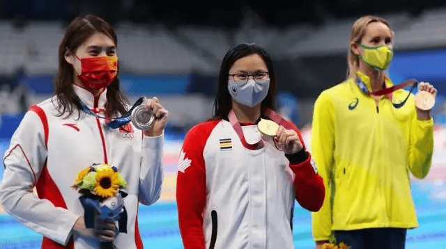 頒獎台上,同時出現了兩張中國面孔,她身邊的是觀眾比較熟悉的中國選手,銀牌得主張雨霏。雖然長著一張中國人的面孔,但小妮是加拿大選手,在她奪冠後升起的也是加拿大的楓葉旗。