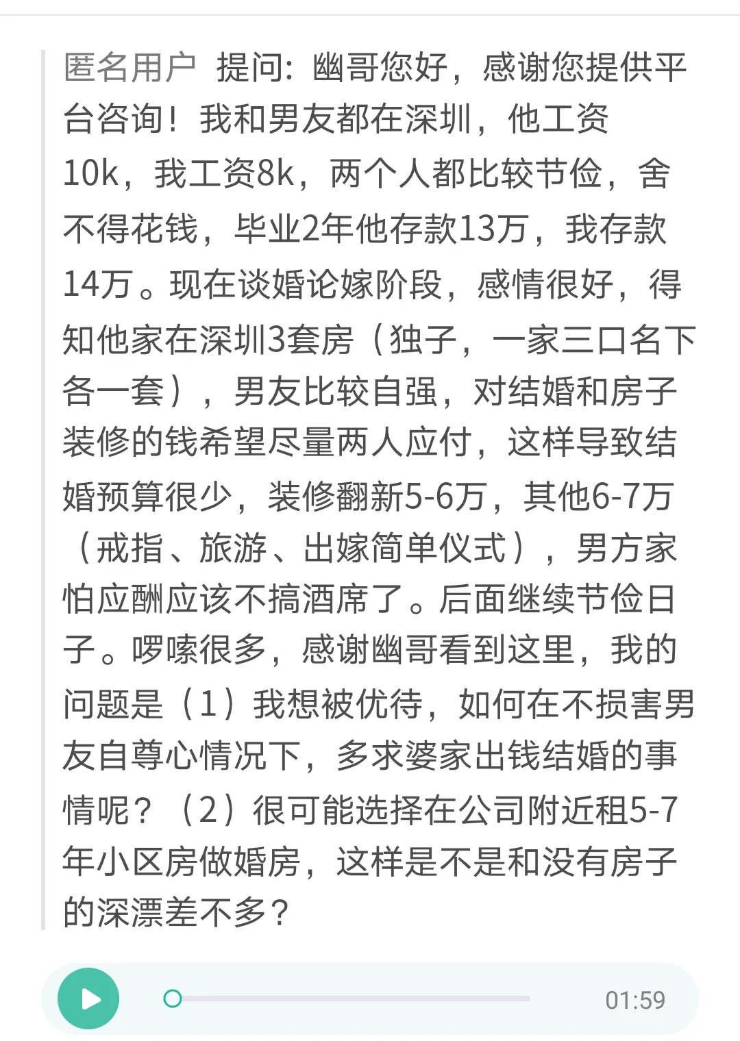 妹妹啊,你就別貪圖別人家3套房啦,本身就跟你不相關,你還不如找個婚前沒房或者願意跟你一起婚後買房的男孩,這好歹彩禮和酒席也都會有,父母、娘家那邊說得過去,自己也對得起自己。