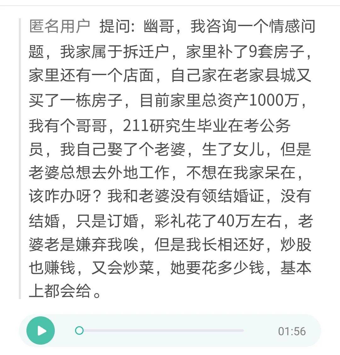 你看這位,家裡算10套房,婚後的老婆為何要走?