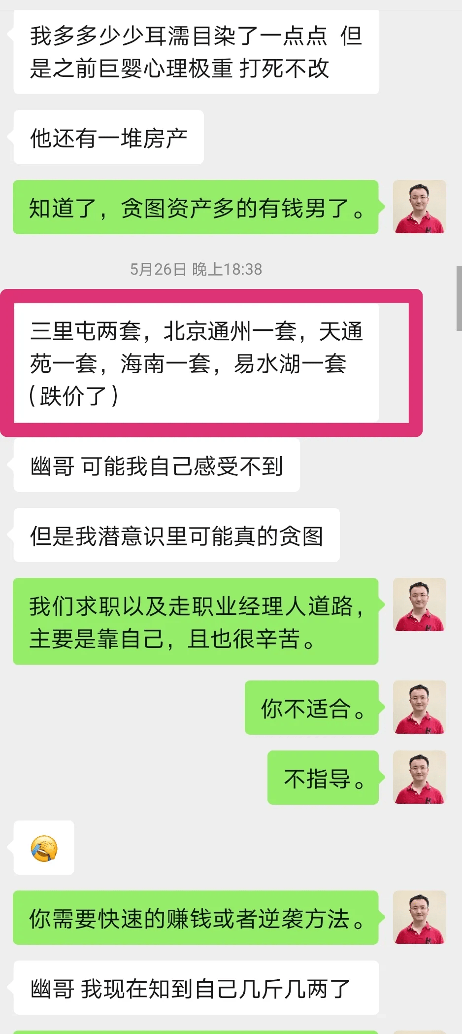 如下跟我對話的這位女孩,可能「窮怕」了,她找了個全國有7套房的男朋友。