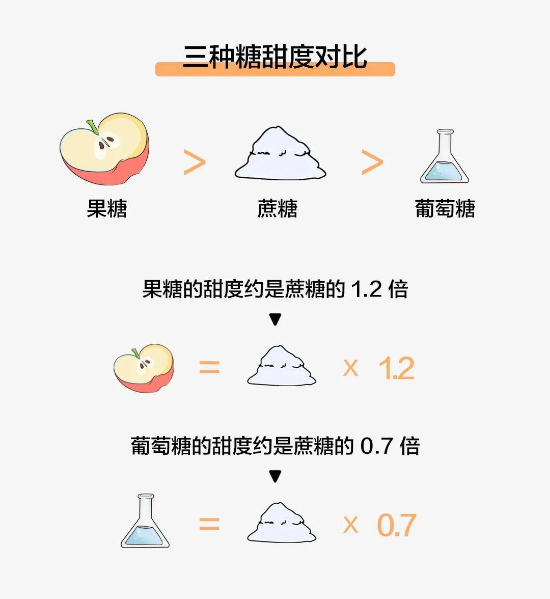 水果里的糖,主要分為葡萄糖、果糖、蔗糖三種。其中果糖甜度最高,蔗糖其次,葡萄糖甜度最低。果糖的甜度約是蔗糖的1.2~1.5倍,而葡萄糖約是蔗糖的0.7倍。如果水果中果糖含量高,那麼原則上吃起來就越甜,但不代表熱量越高。