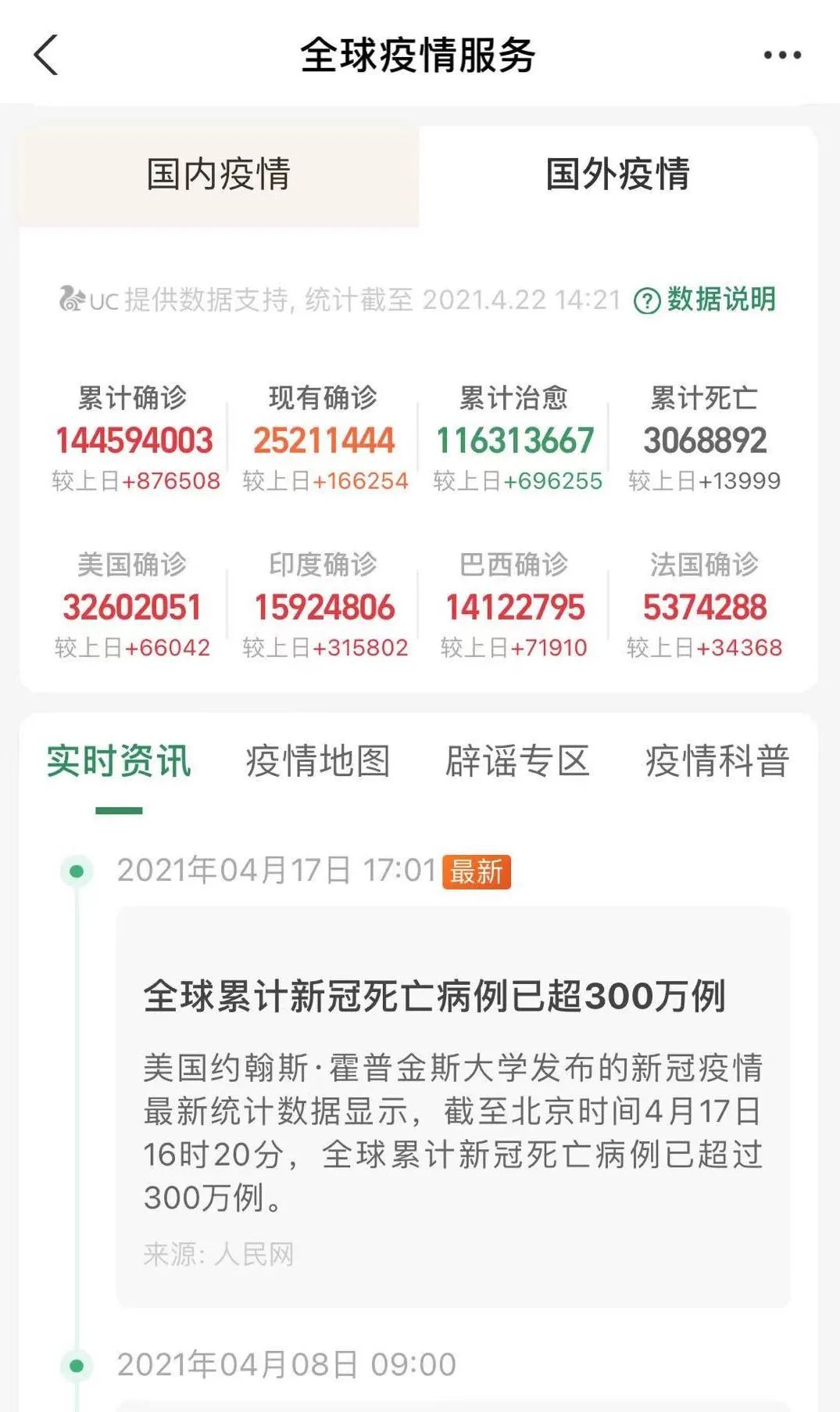 截止4月22日下午14點21分,全球新冠肺炎累計確診144594003例,累計死亡3068892例。