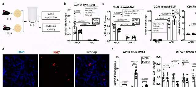此前關於人類脂肪組織晝夜節律性的研究表明,整個白色脂肪組織以及皮下脂肪干細胞中都存在穩健的24小時晝夜節律性。這項新研究揭示了脂肪祖細胞的一個亞群在體內進行晝夜增殖的顯著能力。雖然生物鍾有助於這些增殖信號的晝夜變化,但能量攝入的節律性也是體內這種振盪的關鍵組成部分。