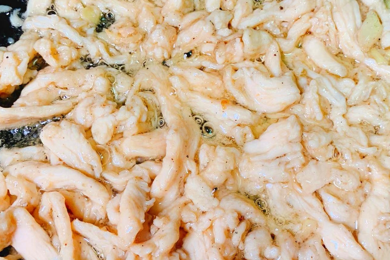 3.鍋燒熱,放入適量的油,油溫7成熱,將醃制好的雞肉絲放入到油鍋中,大火爆炒30秒後,將炒好的雞肉絲起鍋備用。