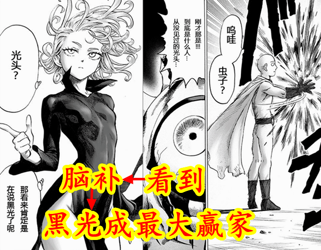 在第一個重製版中,大囧眼的分身看到了埼玉,然後被光頭滅了。埼玉雖強,但沒有名,大囧眼不認識,就提了一句沒見過的光頭。聽到大囧眼提到光頭兩個字,龍卷自己腦補成為了超合金黑光。