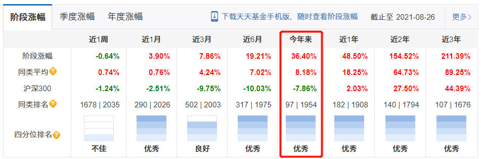 今年以來收益超過36%,大幅跑贏滬深300,在同類基金排名中進入前5%(97/1954)。
