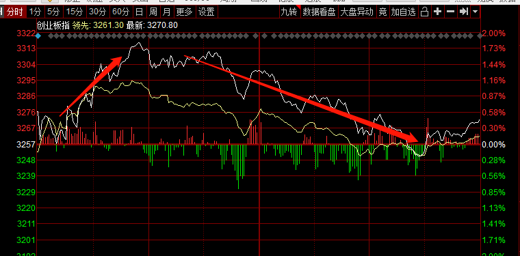 創業板日內走勢沖高回落,成交量放大,難免讓人覺得這是出貨節奏。