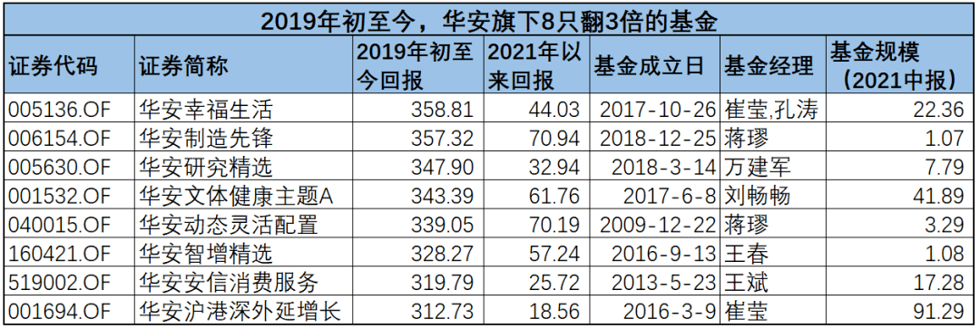 與此對應,公募基金的淨值也水漲船高。Wind數據顯示, 從2019年初至2021年8月31日,2年多的時間里,全市場有 100 只基金的淨值翻 3 倍,其中,華安基金擁有 8 只,在所有基金公司中「3 倍基」數量位列前茅!