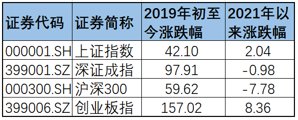 過去兩年,市場呈現結構性牛市。Wind數據顯示,2019年1月1日至2021年8月31日,這兩年多以來,上證指數上漲42.1%,滬深300指數上漲59.62%,深證成指上證97.91%,創業板指數上漲157.02%。