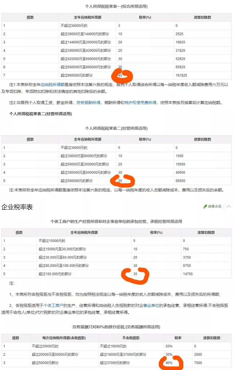 於此同時,針對高收入人群的稅收再分配,提高高收入群體的所得稅稅率,這也是個趨勢。舉例大家就能明白了,如下四張主要是針對個人的所得稅稅率表,你認真看下,尤其我標出來的那四個最高稅率,從35%到45%不等。