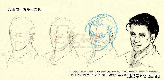 這個時候就要靠我們從大的頭部結構入手,將人物的頭部一分為二進行定位。