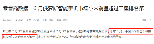 其次是俄羅斯,今年6月份,小米在俄羅斯市場銷量排名第一,市場份額達到了31.2%,超越三星的29.8%,排名第三的是蘋果,份額僅為14.5%。