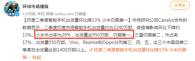 首先來看印度,據市場調研機構Canalys數據顯示,小米手機在第二季度印度市場占有率為29%,出貨量高達950萬台,贏得市場第一。超越三星、vivo、Realme和OPPO。