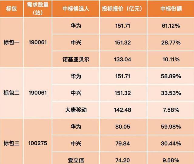 如今,招標結果已經正式出爐,在三個標包中,華為每個標包基本上就拿下了60%的份額,總訂單金額約232億元。