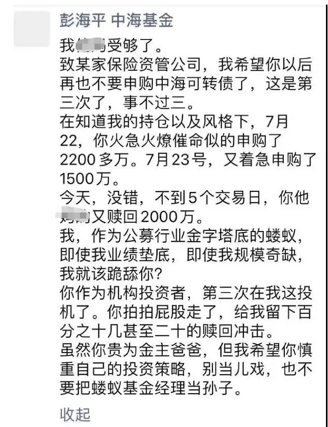 前不久彭海平發朋友圈吐槽了某保險公司資管,希望對方以後不要再申購中海可轉債了,事不過三,「不要把螻蟻基金經理當孫子」。