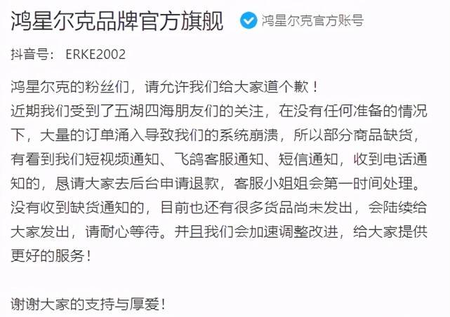 平時冷清的直播間突然爆火,銷售額很快就突破了1億。巔峰時期,鴻星爾克發布致歉聲明,因為大量訂單導致系統崩潰,生產速度跟不上發貨速度,請求消費者退款。