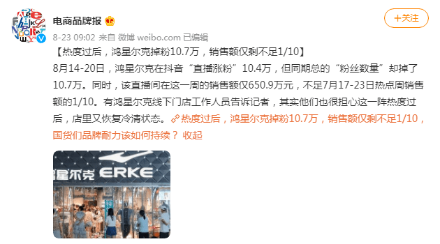 根據有關數據統計,在8月中旬左右,僅一個星期時間,鴻星爾克掉粉10.7萬。銷售額也比不上巔峰時期的十分之一。