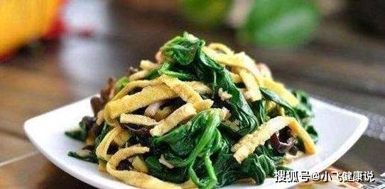 4、菠菜放盤中,倒入蛋皮絲、木耳絲、蒜泥,小半勺鹽和適量味極鮮,淋幾滴麻油拌勻,即可。