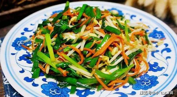 材料:韭菜1把,綠豆芽300克,胡蘿卜半根,鹽1克,生抽2勺,醋1勺,蔥姜適量