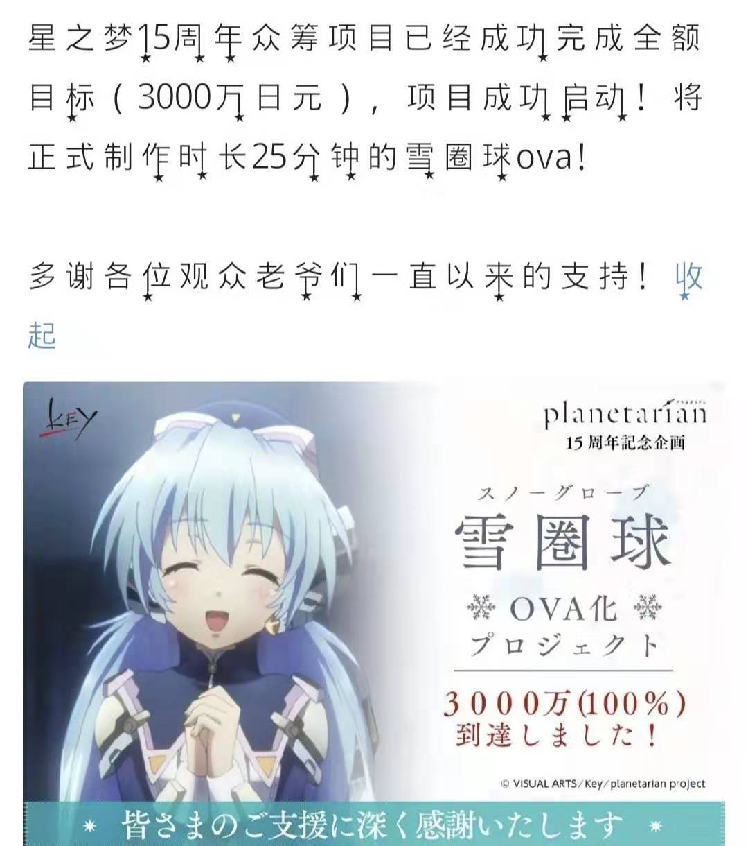 在12月2日,15th planetarian project宣布了Key的《星之夢》15周年紀念企劃《雪圈球》OVA化眾籌成功達成3000萬日元的目標。按照之前的約定,將製作25分鍾的OVA。