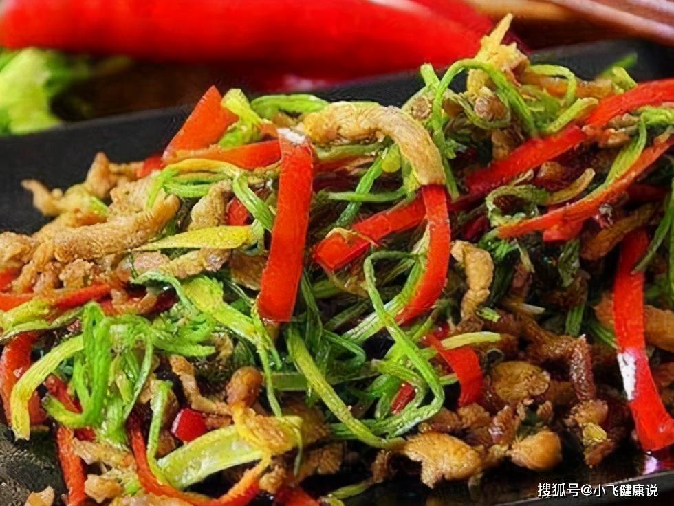 食材:瘦肉300g切成細絲;辣椒適量切絲;香菜梗200g切段;蔥、姜適量;料酒1茶勺;生抽醬油1茶勺