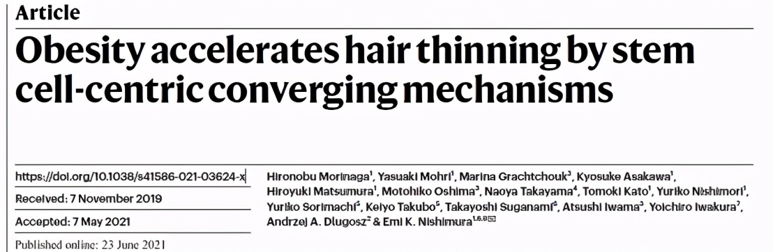 早在8月31日,Nature雜志上發表了一篇題為:「Obesity accelerates hair thinning by stem cell-centric converging mechanisms」的文章,日本東京醫科團隊通過實驗研究,從而發現肥胖會通過耗竭毛囊干細胞(HFSCs),進而引起脫發問題。