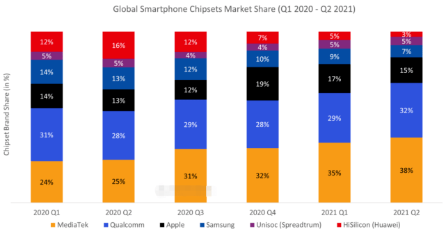 從數據來看,自2020年第三季度開始,聯發科就保持第一,而且增長趨勢非常穩定。高通的晶片出貨量已經和聯發科存在一定的差距了。