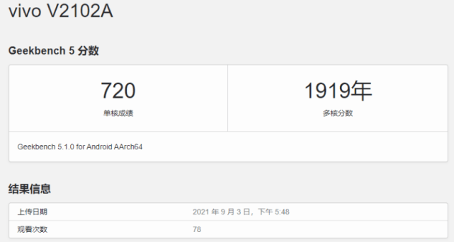 值得關注的是,驍龍898 將採用三星4nm工藝,目前有關跑分已經出爐了。一款代號為vivo V2102A的手機參與了驍龍898的跑分測試,結果顯示單核成績為720,多核跑分為1919。而這款晶片採用雙 Part 3400 新架構,並擁有八個核心。