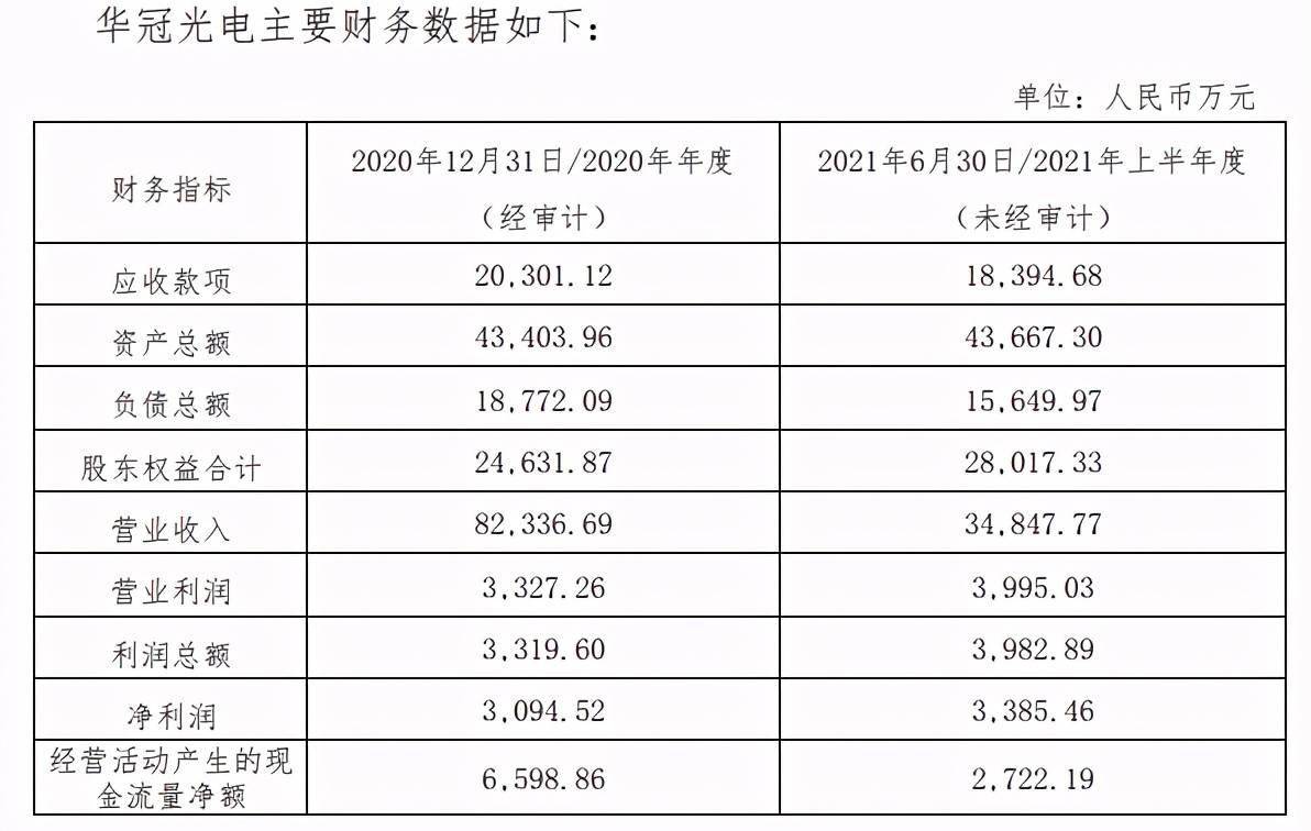 根據公告顯示,2021年上半年華冠光電淨資產為28017.33萬元,實現營收34847.77萬元,淨利潤為3385.46萬元(前述數據均未經審計)。