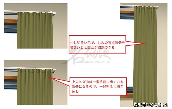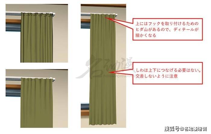 窗簾的褶皺整體是從上往下拉的,我們用筆也要注意遵循這一點規律。