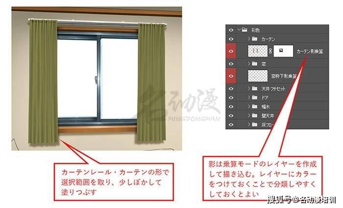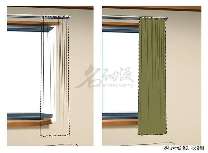 和窗框一樣,窗簾也是會產生影子的和窗框不一樣的是,窗簾和牆壁之間是有空間的,所以窗簾的陰影邊緣要更加模糊一些。