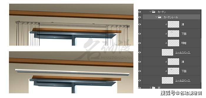 窗簾軌道就是讓我們能夠滑動窗簾的結構。一般它會有兩排平齊的結構,我們只需要注意讓正面保持更亮一些,背面偏暗即可。