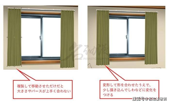 處理完第一個窗簾後,復制並移動到另一側即可。注意透視和光源要和大環境統一,同時盡量對褶皺的結構做一些小的調整,否則會感到很別扭的。