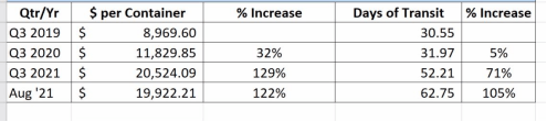 2021 年,運輸貨櫃的價格與運輸時間一起飆升。某家居用品執行長曾在在Twitter上發布了分析,顯示從 2019 年第三季度到 2021 年第三季度,該公司的成本和運輸時間增加了多少:每個貨櫃的價格上漲122%,運輸增加了 105%時間。