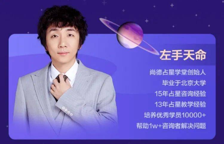 尚德教育占星學院院長——左手天命,畢業於北京大學法學院,因為自身對占星的興趣而入行成為占星師,作為一個曾經的法學生,本就 擅長研究事物的規律變化,轉而研究星象變化時顯然更為得心應手。