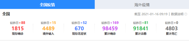 截至1月15日24時,據31個省(自治區、直轄市)和新疆生產建設兵團報告,現有確診病例1113例(其中重症病例38例),累計治癒出院病例82370例,累計死亡病例4635例,累計報告確診病例88118例,現有疑似病例1例。累計追蹤到密切接觸者936427人,尚在醫學觀察的密切接觸者33409人。