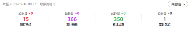 2021年1月15日7時至1月16日7時,內蒙古自治區報告無新增確診病例、疑似病例和無症狀感染者。