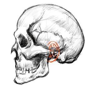 從側面來看,耳朵是位於在視覺中心的,整體是看起來是正的,其實有點點向後傾斜的。耳朵根部的線條是與下頜的輪廓想連在一起的,顯然從側面看耳朵的結構是很明顯的。側面如圖下: