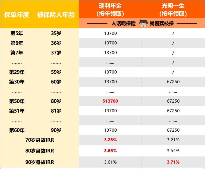 單就IRR來說,活到80歲左右的話,瑞利更高點,而如果壽命更長,光明一生就會反超。