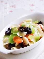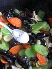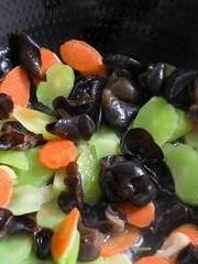 依次下入胡蘿卜、黑木耳、萵筍大火翻炒斷生。