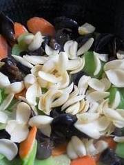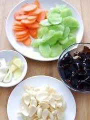 鮮百合一瓣瓣剝開、洗淨瀝干;黑木耳提前泡發,洗淨;萵筍去皮,切片;胡蘿卜去皮,切片;生薑、大蒜切片備用。