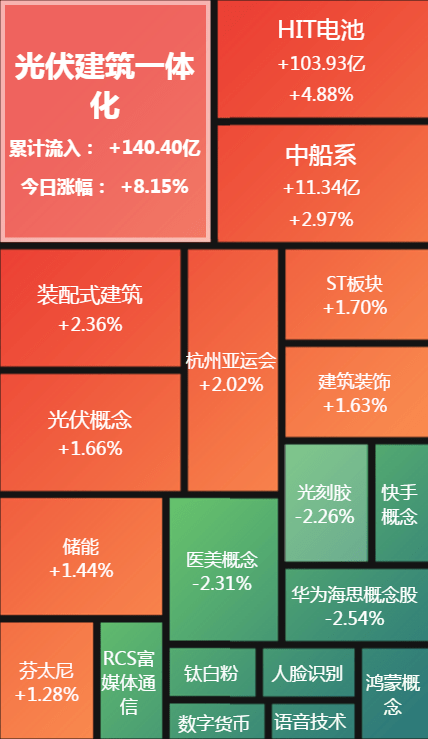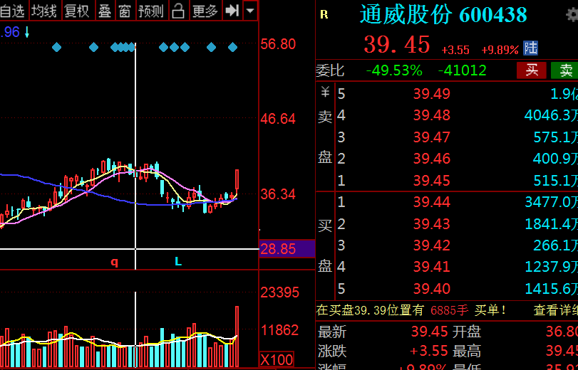 受利好消息刺激,盤面上領漲的主要是稀土永磁、光伏建築裝飾等板塊,隆基股份漲5.48%,通威股份大漲9.89%。