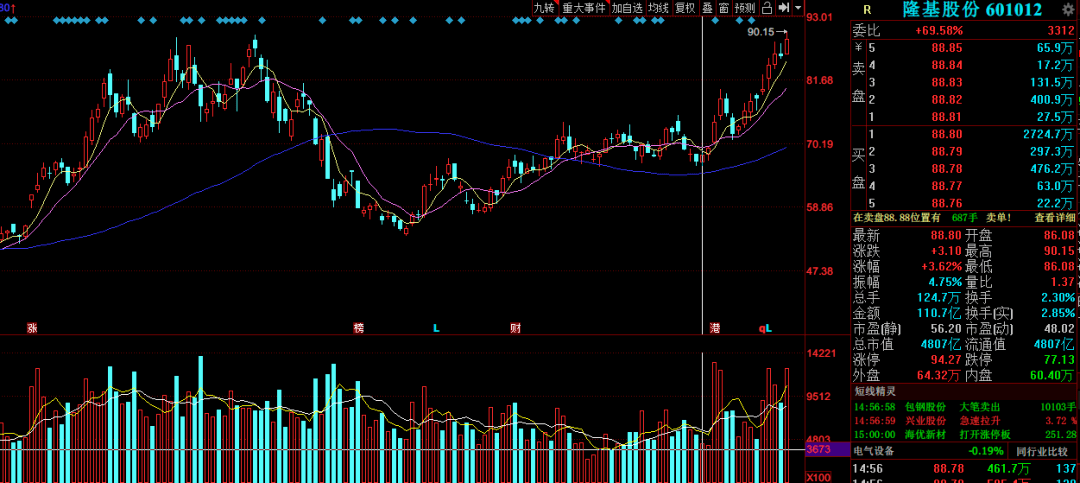 新能源板塊主要是雙創50成份股居多,所以隆基、寧德和通威這些近期的表現都很強。