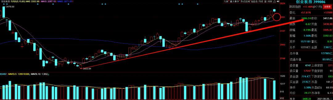 創業板今天雖然是高開跳水,但是整體形態還是比較良好的,短期看5日均線支撐。