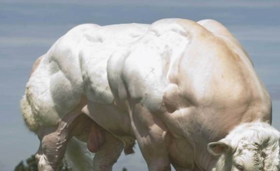 我們可以看到,比利時藍白花牛個體高大,體軀呈長筒狀,體表肌肉醒目,肌肉發達,後臀部尤其明顯。別的不說,這樣看過去,就是全身都充滿肌肉了。其實之所以會這麼多肌肉,也是因為編碼肌肉生長抑制素產生的基因的自然發生的遺傳變異,並因此增加了肌肉纖維的數量,所以這些牛才擁有這麼強壯的肌肉。