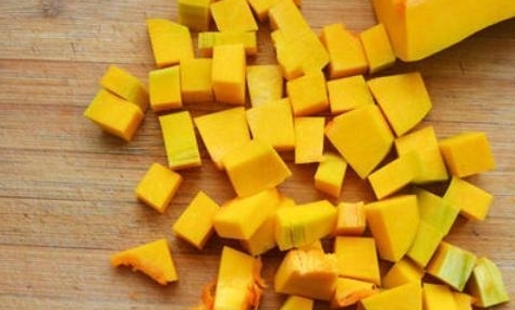 首先我們將南瓜削去皮之後,挖出裡面的瓜瓤,然後在清水當中沖洗干淨,切成塊放在一邊。